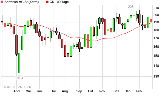 Mit dem Anstieg auf 189,20 EUR hat die Sartorius-Aktie am 25.02.2026 die 100-Tage-Linie nach oben gekreuzt.Die Sartorius-Aktie befindet sich seit dem 13.02.2026 im ...weiterlesen