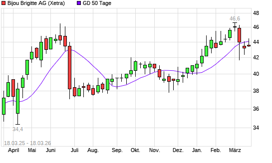 Mit dem Rücksetzer auf 43,90 EUR hat die Bijou Brigitte-Aktie am 17.03.2026 die 50-Tage-Linie nach unten gekreuzt.Die Bijou Brigitte-Aktie befindet sich seit dem 22.12.2025 ...weiterlesen