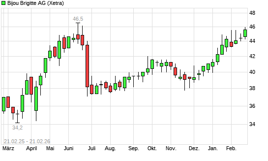 Mit dem Anstieg auf 45,70 EUR hat die Bijou Brigitte-Aktie (ISIN DE0005229504) am 20.02.2026 ein neues 6-Monats-Hoch erreicht und damit den Kurs vom 19.02.2026 eingestellt.Die ...weiterlesen