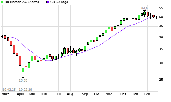 Mit dem Rücksetzer auf 49,65 EUR hat die BB Biotech-Aktie am 18.02.2026 die 50-Tage-Linie nach unten gekreuzt.Die BB Biotech-Aktie befindet sich seit dem 03.09.2025 im ...weiterlesen