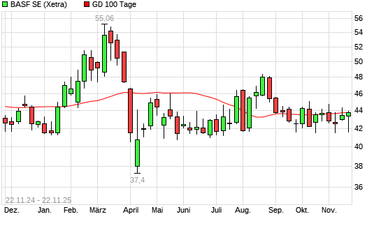 Mit dem Anstieg auf 43,93 EUR hat die BASF-Aktie am 21.11.2025 die 100-Tage-Linie nach oben gekreuzt.Die BASF-Aktie befindet sich seit dem 03.09.2025 im langfristigen Abwärtstrend und hat in ...weiterlesen