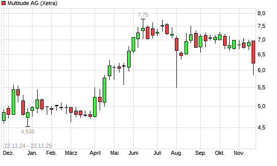 Mit dem Rücksetzer auf 6,01 EUR hat die Multitude-Aktie (ISIN CH1398992755) am 21.11.2025 ein neues 6-Monats-Tief erreicht und damit den Kurs vom 21.05.2025 eingestellt.Die Multitude-Aktie ...weiterlesen