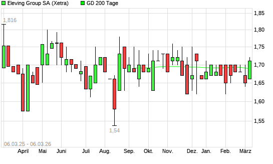 Mit dem Anstieg auf 1,70 EUR hat die ELEVING GROUP-Aktie am 05.03.2026 die 200-Tage-Linie nach oben gekreuzt.Die ELEVING GROUP-Aktie befand sich seit dem 03.03.2026 im ...weiterlesen
