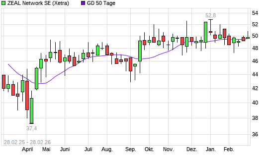 Mit dem Rücksetzer auf 49,20 EUR hat die ZEAL Network-Aktie am 27.02.2026 die 50-Tage-Linie nach unten gekreuzt.Die ZEAL Network-Aktie befindet sich seit dem 05.02.2026 ...weiterlesen