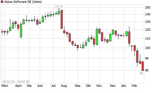 Mit dem Rücksetzer auf 82,90 EUR hat die Atoss Software-Aktie (ISIN DE0005104400) am 18.02.2026 ein neues 12-Monats-Tief erreicht und damit den Kurs vom 17.02.2026 ...weiterlesen