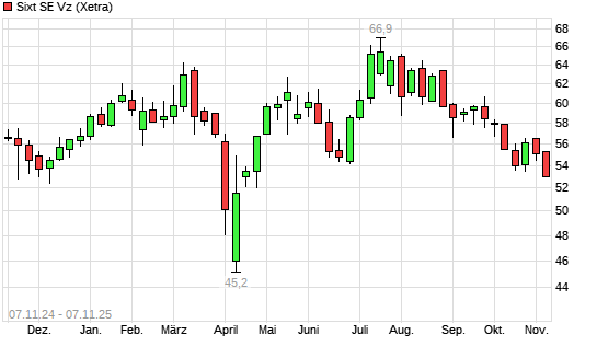 Mit dem Rücksetzer auf 53,10 EUR hat die Sixt Vz-Aktie (ISIN DE0007231334) am 06.11.2025 ein neues 6-Monats-Tief erreicht und damit den Kurs vom 22.10.2025 eingestellt.Die Sixt Vz-Aktie ...weiterlesen