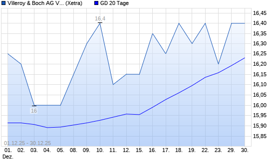 Mit dem Anstieg auf 16,20 EUR hat die Villeroy & Boch Vz-Aktie am 29.12.2025 die 20-Tage-Linie nach oben gekreuzt.Die Villeroy & Boch Vz-Aktie befindet sich seit dem 28.10.2025 im langfristigen ...weiterlesen