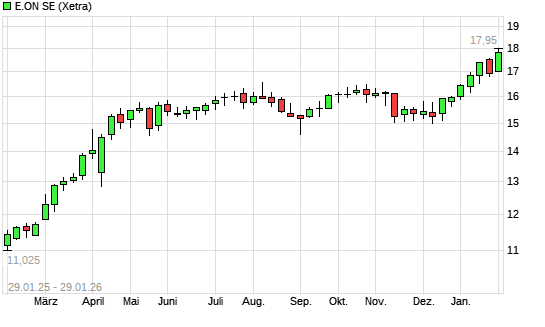 Mit dem Anstieg auf 17,75 EUR hat die E.ON-Aktie (ISIN DE000ENAG999) am 28.01.2026 ein neues 10-Jahres-Hoch erreicht und damit den Kurs vom 27.01.2026 eingestellt.Die E.ON-Aktie ...weiterlesen