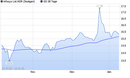 Mit dem Anstieg auf 15,25 EUR hat die Infosys ADR-Aktie am 12.01.2026 die 38-Tage-Linie nach oben gekreuzt.Die Infosys ADR-Aktie befindet sich seit dem 18.12.2025 im langfristigen Aufwärtstrend ...weiterlesen
