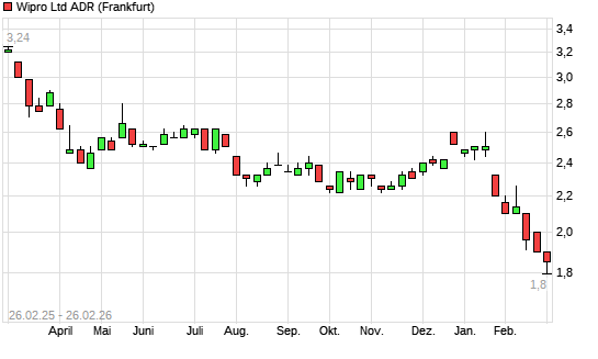 Mit dem Rücksetzer auf 1,80 EUR hat die Wipro ADR-Aktie (ISIN US97651M1099) am 25.02.2026 ein neues 5-Jahres-Tief erreicht und damit den Kurs vom 24.02.2026 eingestellt.Die ...weiterlesen