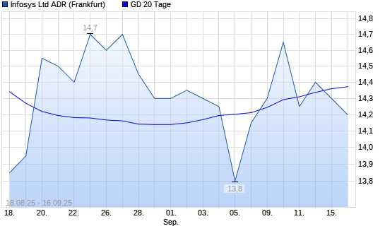 Mit dem Rücksetzer auf 14,30 EUR hat die Infosys ADR-Aktie am 15.09.2025 die 20-Tage-Linie nach unten gekreuzt.Die Infosys ADR-Aktie befindet sich seit dem 28.02.2025 im langfristigen Abwärtstrend ...weiterlesen