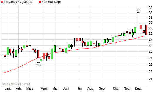Mit dem Rücksetzer auf 27,20 EUR hat die DEFAMA-Aktie am 20.12.2024 die 100-Tage-Linie nach unten gekreuzt.Die DEFAMA-Aktie befindet sich seit dem 04.12.2023 im langfristigen Aufwärtstrend ...weiterlesen