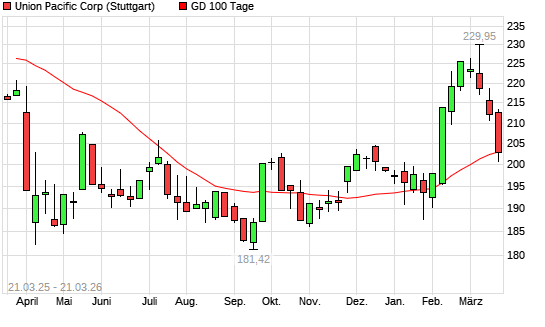 Mit dem Rücksetzer auf 201,85 EUR hat die Union Pacific-Aktie am 20.03.2026 die 100-Tage-Linie nach unten gekreuzt.Die Union Pacific-Aktie befindet sich seit dem 02.02.2026 ...weiterlesen