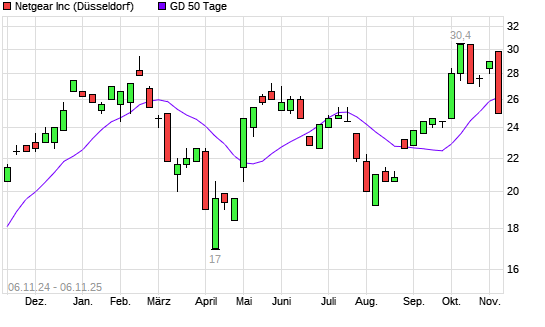 Mit dem Rücksetzer auf 25,60 EUR hat die Netgear-Aktie am 05.11.2025 die 50-Tage-Linie nach unten gekreuzt.Die Netgear-Aktie befindet sich seit dem 10.09.2025 im langfristigen Aufwärtstrend ...weiterlesen