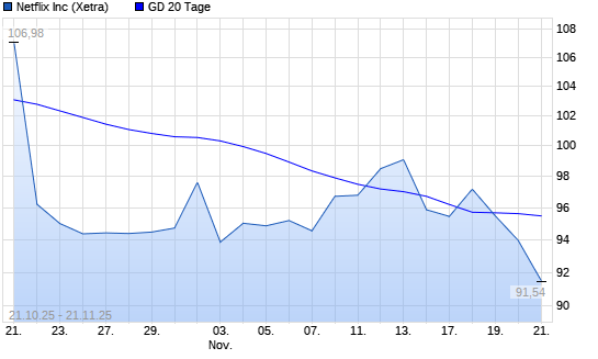 Mit dem Rücksetzer auf 92,04 EUR hat die Netflix-Aktie am 20.11.2025 die 20-Tage-Linie nach unten gekreuzt.Die Netflix-Aktie befindet sich seit dem 13.11.2025 im langfristigen Abwärtstrend ...weiterlesen
