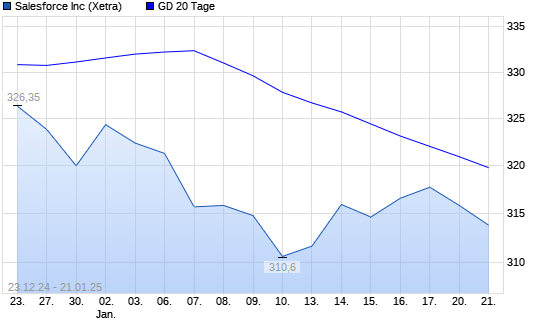 Mit dem Rücksetzer auf 316,20 EUR hat die Salesforce-Aktie am 20.01.2025 die 20-Tage-Linie nach unten gekreuzt.Die Salesforce-Aktie befindet sich seit dem 02.10.2024 im langfristigen Aufwärtstrend ...weiterlesen