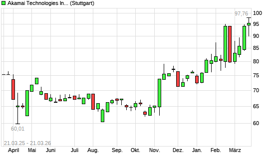 Mit dem Anstieg auf 95,38 EUR hat die Akamai Technologies-Aktie (ISIN US00971T1016) am 20.03.2026 ein neues 12-Monats-Hoch erreicht und damit den Kurs vom 19.03.2026 eingestellt.Die ...weiterlesen