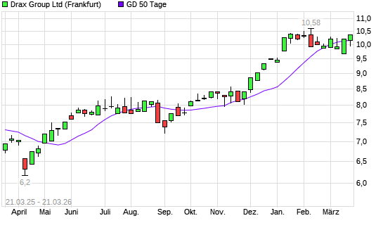 Mit dem Anstieg auf 10,36 EUR hat die DRAX GROUP-Aktie am 20.03.2026 die 50-Tage-Linie nach oben gekreuzt.Die DRAX GROUP-Aktie befindet sich seit dem 08.09.2025 im ...weiterlesen
