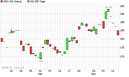 Mit dem Rücksetzer auf 188,25 EUR hat die DSV-Aktie am 17.11.2025 die 200-Tage-Linie nach unten gekreuzt.Die DSV-Aktie befand sich seit dem 11.11.2025 im langfristigen ...weiterlesen