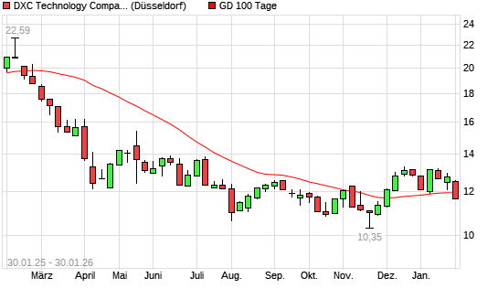 Mit dem Rücksetzer auf 11,76 EUR hat die DXC Technology-Aktie am 29.01.2026 die 100-Tage-Linie nach unten gekreuzt.Die DXC Technology-Aktie befindet sich seit dem 28.01.2026 im langfristigen ...weiterlesen
