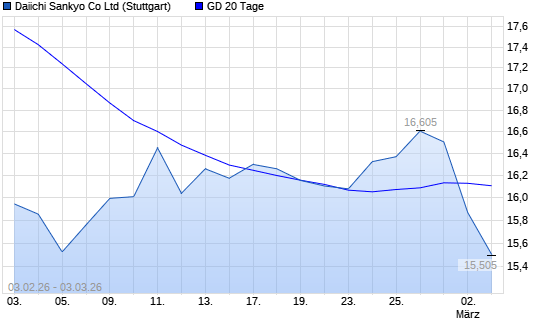 Mit dem Rücksetzer auf 15,80 EUR hat die Daiichi Sankyo-Aktie am 02.03.2026 die 20-Tage-Linie nach unten gekreuzt.Die Daiichi Sankyo-Aktie befindet sich seit dem 26.11.2025 ...weiterlesen