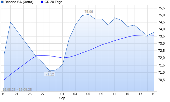 Mit dem Rücksetzer auf 73,30 EUR hat die Danone-Aktie am 18.09.2025 die 20-Tage-Linie nach unten gekreuzt.Die Danone-Aktie befindet sich seit dem 30.07.2025 im langfristigen Aufwärtstrend ...weiterlesen