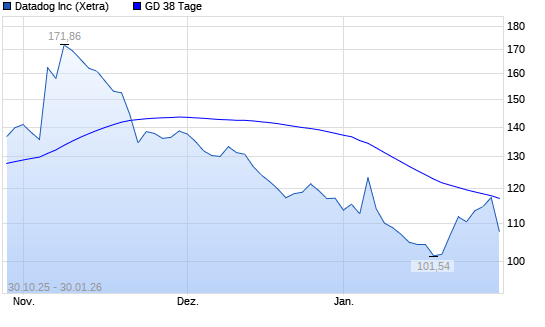 Mit dem Rücksetzer auf 106,82 EUR hat die Datadog-Aktie am 29.01.2026 die 38-Tage-Linie nach unten gekreuzt.Die Datadog-Aktie befindet sich seit dem 09.01.2026 im langfristigen Abwärtstrend ...weiterlesen