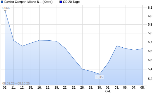 Mit dem Rücksetzer auf 5,49 EUR hat die Davide Campari-Milano-Aktie am 07.10.2025 die 20-Tage-Linie nach unten gekreuzt.Die Davide Campari-Milano-Aktie befindet sich seit dem 18.09.2025 ...weiterlesen