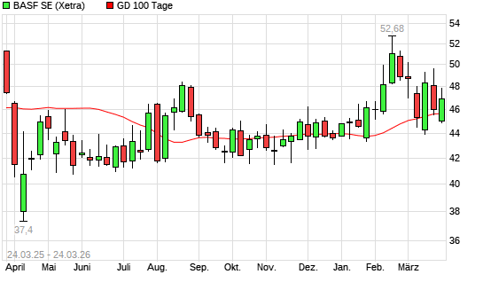 Mit dem Anstieg auf 47,12 EUR hat die BASF-Aktie am 23.03.2026 die 100-Tage-Linie nach oben gekreuzt.Die BASF-Aktie befindet sich seit dem 21.01.2026 im langfristigen Aufwärtstrend und ...weiterlesen