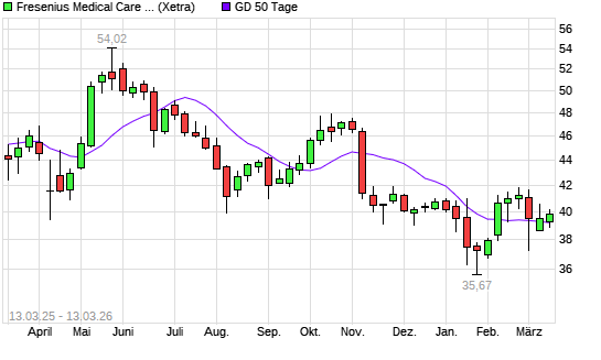 Mit dem Anstieg auf 39,56 EUR hat die Fresenius Medical Care-Aktie am 12.03.2026 die 50-Tage-Linie nach oben gekreuzt.Die Fresenius Medical Care-Aktie befindet sich seit dem 04.11.2025 ...weiterlesen
