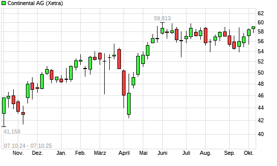 Mit dem Anstieg auf 59,44 EUR hat die Continental-Aktie (ISIN DE0005439004) am 06.10.2025 ein neues 12-Monats-Hoch erreicht und damit den Kurs vom 10.07.2025 eingestellt.Die Continental-Aktie ...weiterlesen