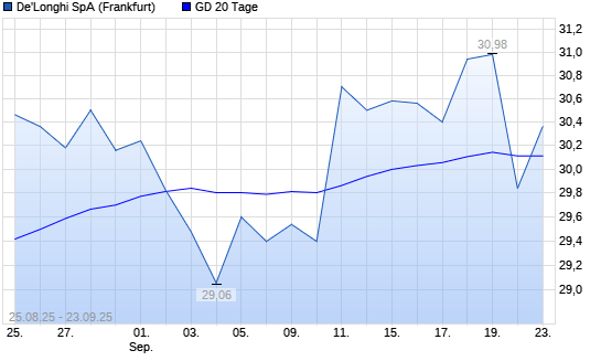 Mit dem Rücksetzer auf 29,84 EUR hat die De'Longhi-Aktie am 22.09.2025 die 20-Tage-Linie nach unten gekreuzt.Die De'Longhi-Aktie befindet sich seit dem 11.09.2025 im langfristigen Aufwärtstrend ...weiterlesen