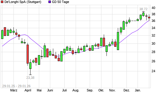 Mit dem Rücksetzer auf 36,68 EUR hat die De'Longhi-Aktie am 28.01.2026 die 50-Tage-Linie nach unten gekreuzt.Die De'Longhi-Aktie befindet sich seit dem 17.10.2025 im ...weiterlesen