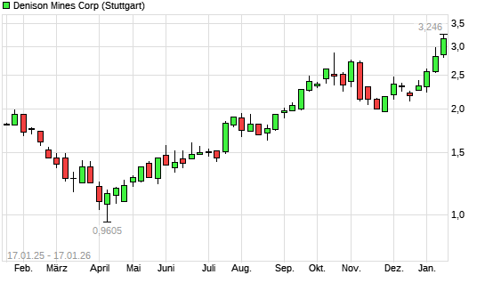 Mit dem Anstieg auf 3,20 EUR hat die Denison Mines-Aktie (ISIN CA2483561072) am 16.01.2026 ein neues 10-Jahres-Hoch erreicht und damit den Kurs vom 15.01.2026 eingestellt.Die Denison Mines-Aktie ...weiterlesen