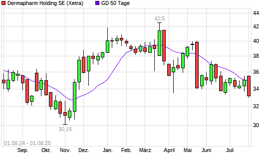 Mit dem Rücksetzer auf 33,50 EUR hat die Dermapharm Holding-Aktie am 31.07.2025 die 50-Tage-Linie nach unten gekreuzt.Die Dermapharm Holding-Aktie befindet sich seit dem 11.06.2025 im langfristigen ...weiterlesen