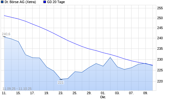 Mit dem Rücksetzer auf 226,40 EUR hat die Deutsche Börse-Aktie am 10.10.2025 die 20-Tage-Linie nach unten gekreuzt.Die Deutsche Börse-Aktie befindet sich seit dem 28.08.2025 im langfristigen ...weiterlesen
