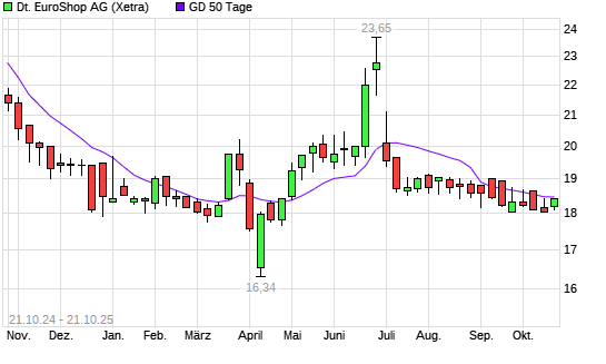 Mit dem Anstieg auf 18,62 EUR hat die Deutsche EuroShop-Aktie am 20.10.2025 die 50-Tage-Linie nach oben gekreuzt.Die Deutsche EuroShop-Aktie befindet sich seit dem 21.08.2025 im langfristigen ...weiterlesen
