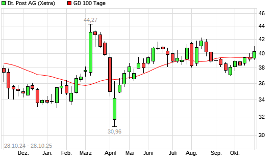 Mit dem Anstieg auf 39,79 EUR hat die Deutsche Post DHL-Aktie am 27.10.2025 die 100-Tage-Linie nach oben gekreuzt.Die Deutsche Post DHL-Aktie befindet sich seit dem 02.10.2025 im langfristigen ...weiterlesen