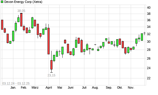 Mit dem Anstieg auf 32,27 EUR hat die Devon Energy-Aktie (ISIN US25179M1036) am 02.12.2025 ein neues 6-Monats-Hoch erreicht und damit den Kurs vom 01.12.2025 eingestellt.Die Devon Energy-Aktie ...weiterlesen