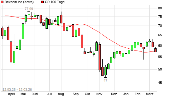 Mit dem Rücksetzer auf 57,14 EUR hat die Dexcom-Aktie am 11.03.2026 die 100-Tage-Linie nach unten gekreuzt.Die Dexcom-Aktie befindet sich seit dem 05.03.2026 im ...weiterlesen