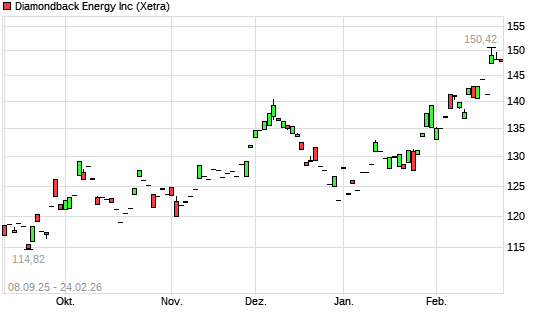 Mit dem Anstieg auf 148,30 EUR hat die Diamondback Energy-Aktie (ISIN US25278X1090) am 23.02.2026 ein neues 6-Monats-Hoch erreicht und damit den Kurs vom 20.02.2026 ...weiterlesen