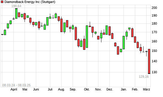 Mit dem Rücksetzer auf 128,78 EUR hat die Diamondback Energy-Aktie (ISIN US25278X1090) am 07.03.2025 ein neues 12-Monats-Tief erreicht und damit den Kurs vom 06.03.2025 eingestellt.Die ...weiterlesen