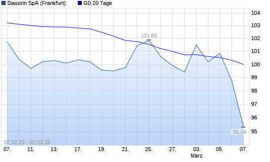 Mit dem Rücksetzer auf 98,78 EUR hat die Diasorin-Aktie am 06.03.2025 die 20-Tage-Linie nach unten gekreuzt.Die Diasorin-Aktie befindet sich seit dem 26.02.2025 im langfristigen Abwärtstrend ...weiterlesen