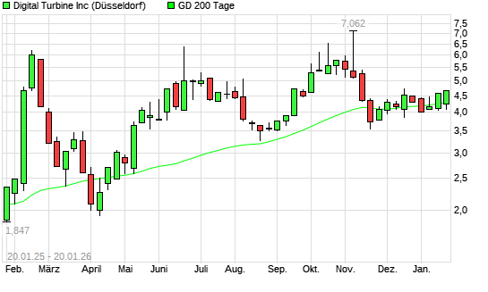 Mit dem Rücksetzer auf 4,24 EUR hat die Digital Turbine-Aktie am 19.01.2026 die 200-Tage-Linie nach unten gekreuzt.Die Digital Turbine-Aktie befand sich seit dem 14.01.2026 ...weiterlesen