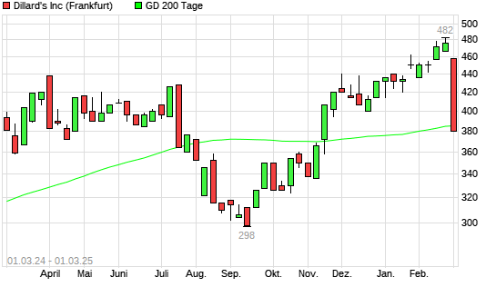 Mit dem Rücksetzer auf 380,00 EUR hat die Dillards A-Aktie am 28.02.2025 die 200-Tage-Linie nach unten gekreuzt.Die Dillards A-Aktie befand sich seit dem 15.11.2024 im langfristigen Abwärtstrend ...weiterlesen