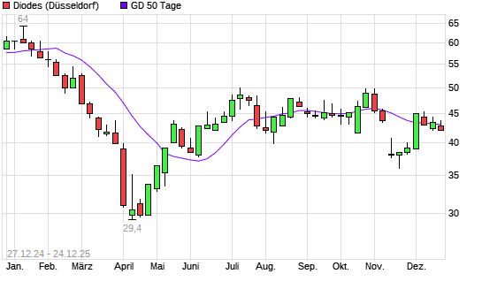 Mit dem Rücksetzer auf 42,40 EUR hat die Diodes-Aktie am 23.12.2025 die 50-Tage-Linie nach unten gekreuzt.Die Diodes-Aktie befindet sich seit dem 04.12.2025 im langfristigen Aufwärtstrend ...weiterlesen
