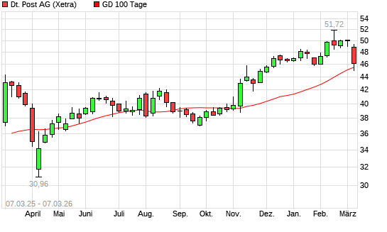 Mit dem Anstieg auf 46,48 EUR hat die Deutsche Post DHL-Aktie am 06.03.2026 die 100-Tage-Linie nach oben gekreuzt.Die Deutsche Post DHL-Aktie befindet sich seit dem 02.10.2025 ...weiterlesen