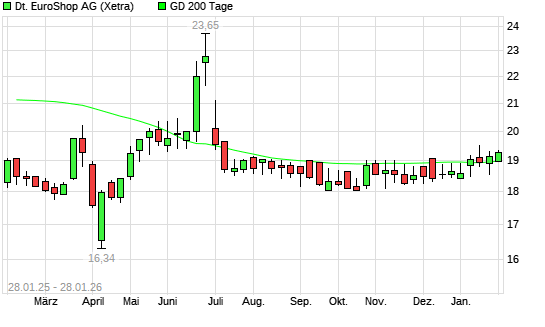 Mit dem Anstieg auf 19,14 EUR hat die Deutsche EuroShop-Aktie am 27.01.2026 die 200-Tage-Linie nach oben gekreuzt.Die Deutsche EuroShop-Aktie befand sich seit dem 21.01.2026 im langfristigen ...weiterlesen