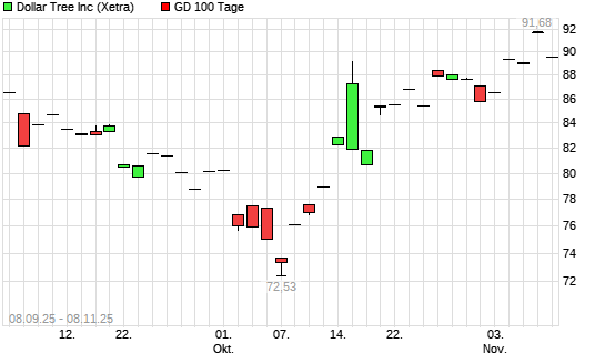 Mit dem Anstieg auf 91,38 EUR hat die Dollar Tree-Aktie am 07.11.2025 die 100-Tage-Linie nach oben gekreuzt.Die Dollar Tree-Aktie befindet sich seit dem 13.10.2025 im langfristigen Aufwärtstrend ...weiterlesen