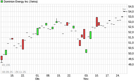 Mit dem Anstieg auf 54,03 EUR hat die Dominion Energy-Aktie (ISIN US25746U1097) am 28.11.2025 ein neues 6-Monats-Hoch erreicht und damit den Kurs vom 27.11.2025 eingestellt.Die Dominion Energy-Aktie ...weiterlesen